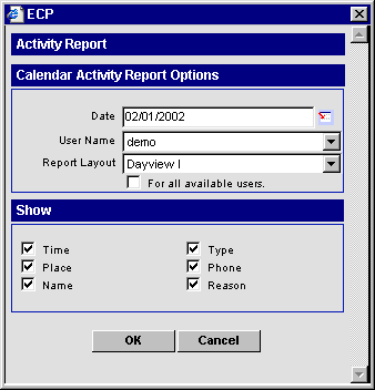 Select Calendar Activity Reports from the Reports menu to set up and print the Activities or To Do items that have been scheduled on the calendar for any day, week, or month.