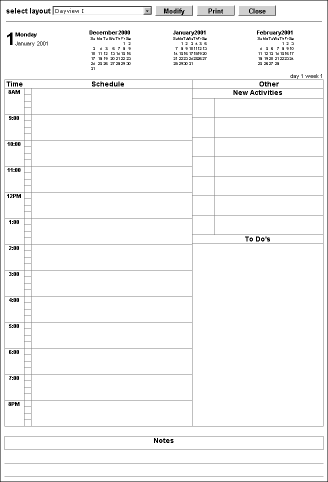 DayView II - Prints the scheduled activities in three 1/3 paper-width groups (Morning, Afternoon, and Evening), and the To Do and New Activities items below the scheduled activities at full-width.