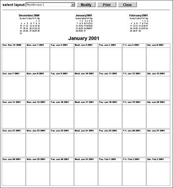Trifold - Divides the calendar page into thirds and prints in landscape format. The scheduled activities are on the left, the months of the current year are in the middle, and the To Do list is on the right. The left and right thirds of the page can be folded over the middle to form a booklet.
